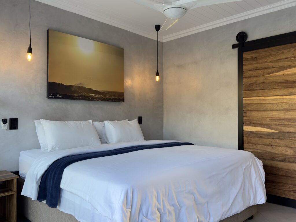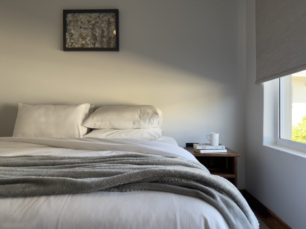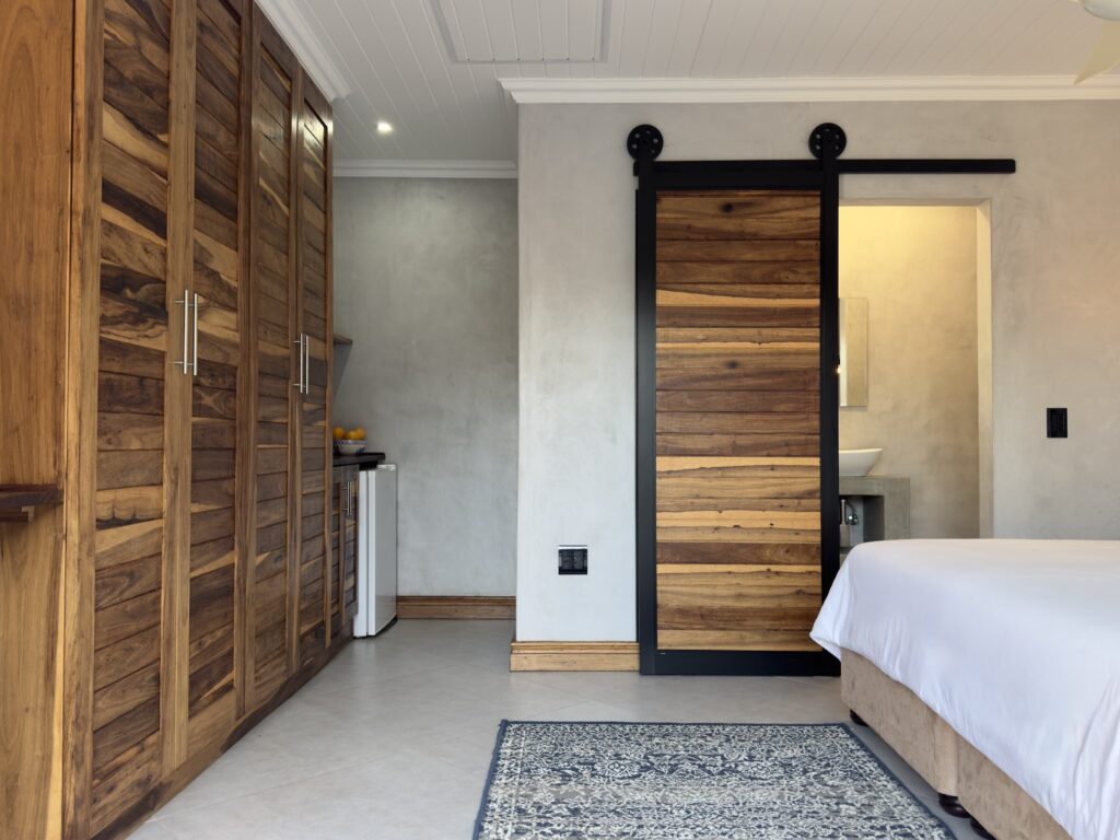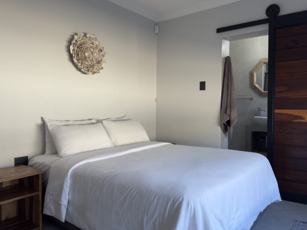 Spacious and serene with a queen bed, a generous kitchenette, and walk-in shower — ideal for longer stays.