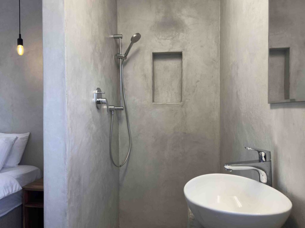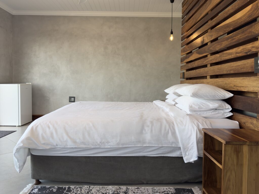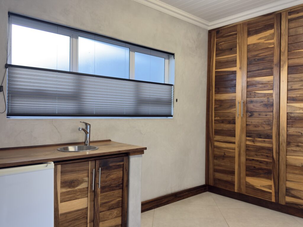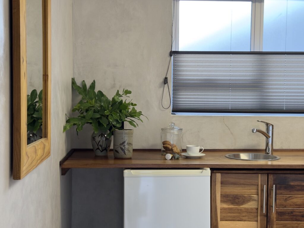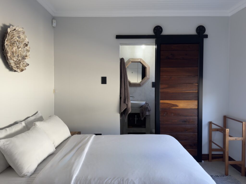 Spacious and serene with a queen bed, a generous kitchenette, and walk-in shower — ideal for longer stays.